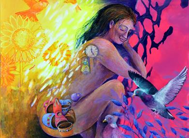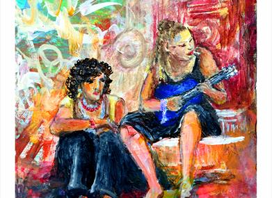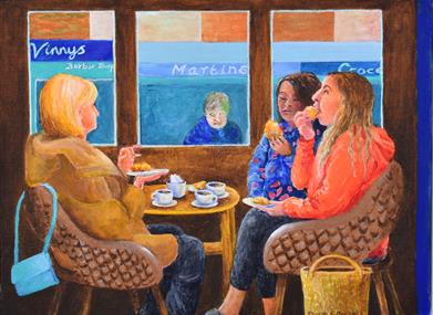 Sharon Fuller now lives in Seaford. She is showing lively and vibrant paintings and prints with a focus on people and their interactions. Margaret Howker is showing mixed-media paintings inspired by the landscape of the Lake District and Jan Reeves shows exquisite still-life paintings. You can view some of Sharon Fuller's work on website: sharonfullerart.co.uk